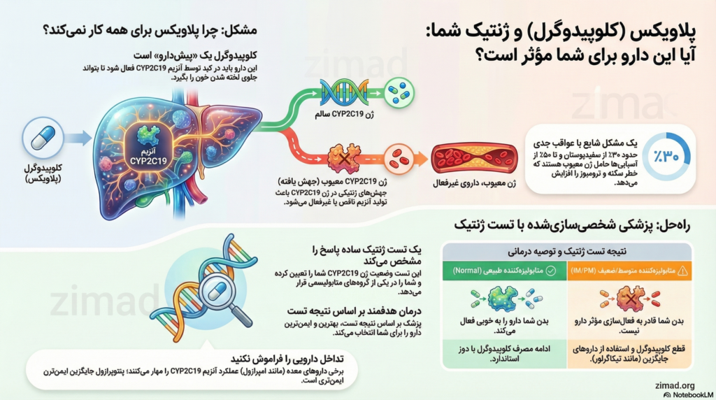 آیا کلوپیدوگرل برای بدن شما مناسب است؟ پاسخ بستگی به DNA شما دارد. اگر ژنوتیپ نرمال دارید، ایمن و مؤثر است. اما اگر ژنوتیپ معیوب دارید، مصرف آن می‌تواند خطرناک باشد. با انجام تست ژنتیک و مدیریت تداخلات دارویی، می‌توانیم قدرت واقعی این دارو را برای پاسخ‌دهندگان حفظ کنیم و دیگران را با داروهای جایگزین نجات دهیم.