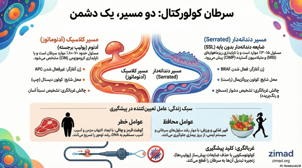 “مسیر دندانهدار” (Serrated Pathway) درک ما را از هتروژنیتی مولکولی CRC متحول کرده است. این مسیر مسئول ۱۵ تا ۳۰ درصد موارد سرطان کولورکتال است و از نظر بیولوژیکی و بالینی کاملاً متمایز است.