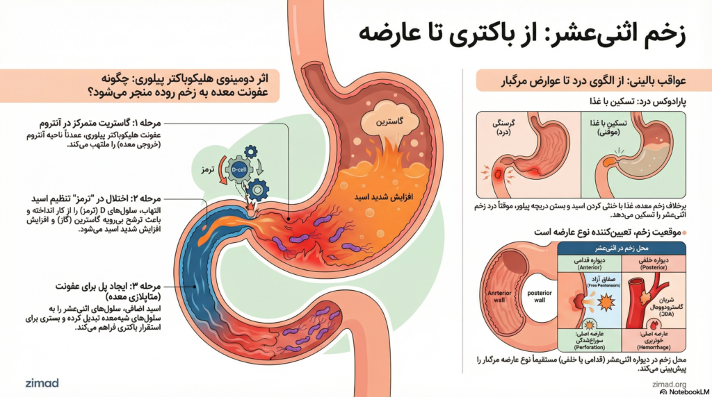 تحلیل جامع نشان میدهد که زخم اثنیعشر حاصل برهمکنش پیچیده میان عفونت H. pylori (التهاب آنترال و سرکوب سلول D) و پاسخهای فیزیولوژیک میزبان (هایپرگاسترینمی و متاپلازی معده) است. تفاوتهای بارز بالینی با زخم معده ریشه در دینامیک ترشحی دارد. درک آناتومی (قدامی vs خلفی) پیشبینیکننده نوع عوارض مرگبار است.