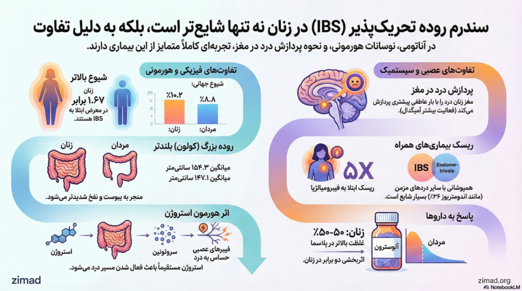 سندرم روده تحریکپذیر (Irritable Bowel Syndrome – IBS) به عنوان یک اختلال عملکردی مزمن دستگاه گوارش، یکی از پیچیدهترین چالشها در حوزه نوروگاستروانترولوژی محسوب میشود. این اختلال که با درد مکرر شکمی و تغییر در عادات اجابت مزاج مشخص میگردد، تفاوتهای جنسیتی عمیقی را در تمامی ابعاد از جمله اپیدمیولوژی، تظاهرات بالینی، مکانیسمهای پاتوفیزیولوژیک و پاسخهای درمانی نشان میدهد. شواهد اپیدمیولوژیک جهانی به طور مداوم نشان دادهاند که زنان به طور نامتناسبی بیش از مردان تحت تأثیر این بیماری قرار میگیرند، به طوری که نسبت ابتلای زنان به مردان در جوامع مختلف بین ۲ به ۱ تا ۲.۵ به ۱ برآورد شده است. این عدم توازن جنسیتی تنها یک مشاهده آماری ساده نیست، بلکه ریشه در تداخلات ظریف میان سیستمهای غدد درونریز، اعصاب مرکزی، ایمنی و آناتومی خاص دستگاه گوارش زنان دارد. تحلیل حاضر با رویکردی عمیق، به بررسی پارامترهای بیولوژیک و بیوپسیبکوسوشیال میپردازد که زنان را به شکلی متمایز مستعد ابتلا به این اختلال کرده و تجربه بیماری را در این جمعیت تغییر میدهد.