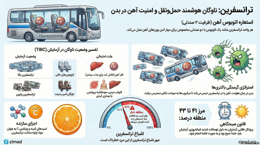 - استعاره اتوبوس آهن: تصور کنید آهن (Fe3+) مسافری است که اگر در خیابانهای خون به تنهایی قدم بزند، به هر بافتی آسیب میرساند. ترانسفرین مانند یک «اتوبوس اختصاصی» عمل میکند که در تمام سطح بدن گشت میزند. هر دستگاه از این اتوبوسها دارای ۲ صندلی مخصوص برای مهار یونهای آهن است. کل ظرفیت این ناوگان در خون را TIBC (ظرفیت کل اتصال به آهن) مینامیم.
